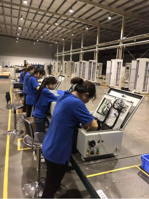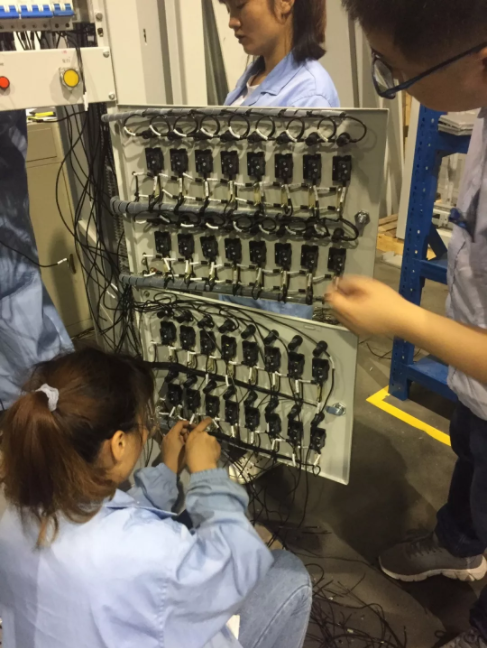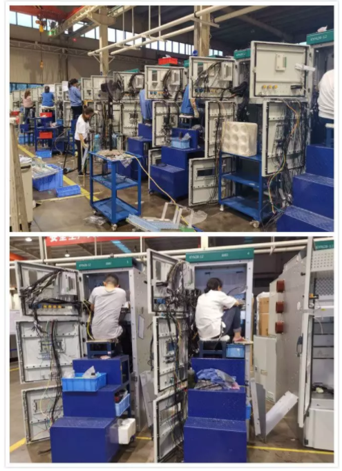 新疆阿克塔木17臺KYN28柜項目生產現場,在工藝要求極高,二次線頭數平均約1200個的情況下,二次線班組堅持一人一臺的有序工作安排,最終用3天時間完成了生產任務!
