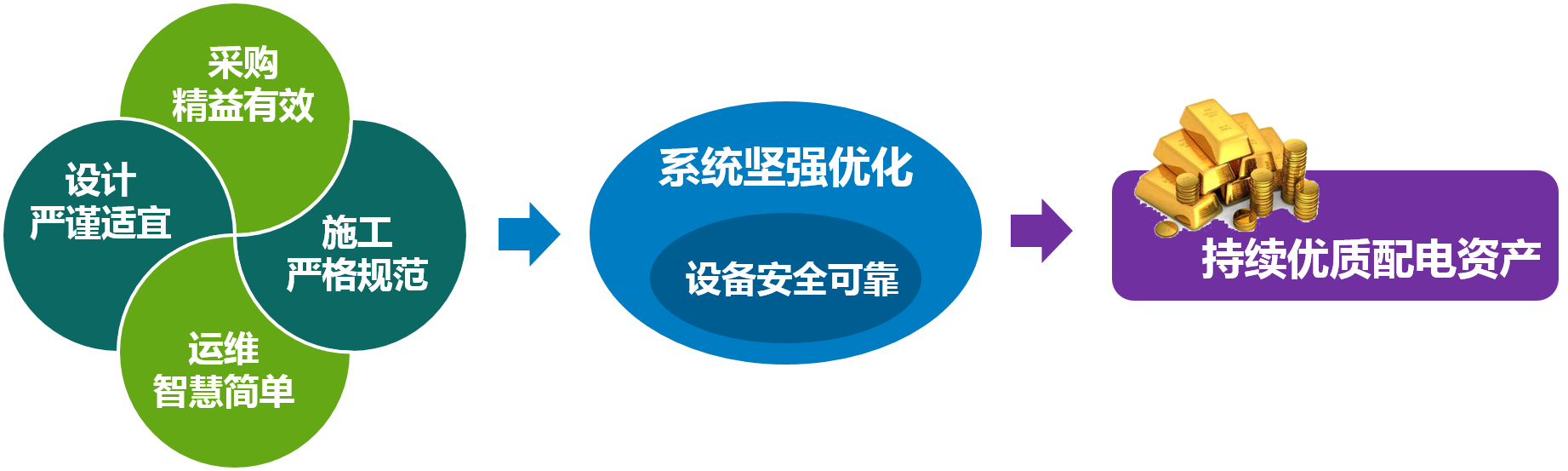 我們通過嚴(yán)謹(jǐn)適宜的設(shè)計、精益有效的采購、嚴(yán)格規(guī)范的施工和智慧簡單的運維,建設(shè)并運營一個由安全可靠的智能設(shè)備組成的堅強優(yōu)化的配用電系統(tǒng),向業(yè)主提交一套持續(xù)優(yōu)質(zhì)的配電資產(chǎn)。