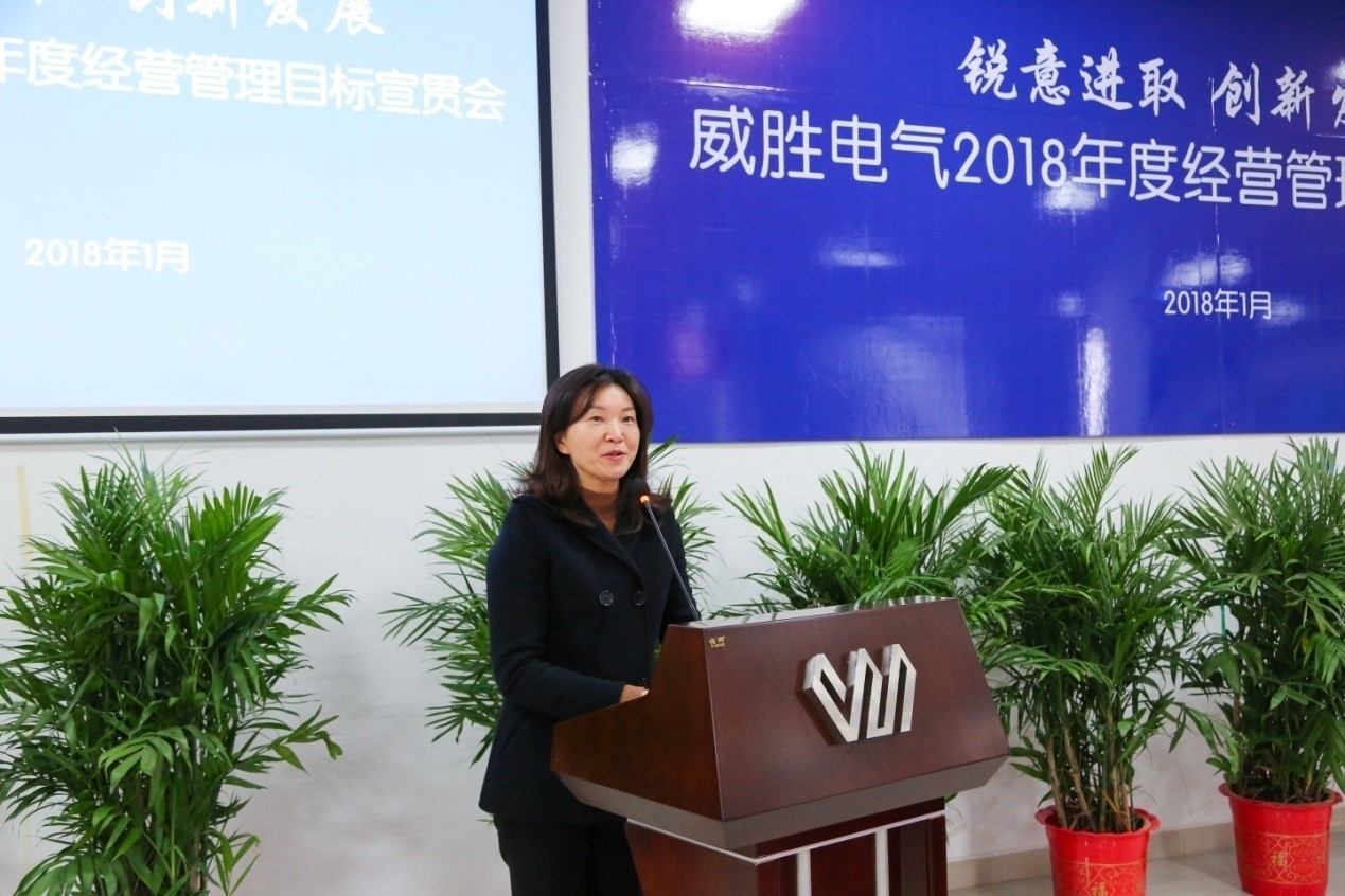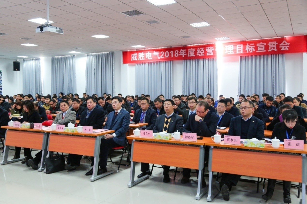 2018年1月8日下午,以“銳意進取,創新發展”為主題的威勝電氣2018年經營管理目標宣貫會在電氣產業園會議中心培訓室順利召開??毓啥聲飨?、控股本部、威勝電氣董事會以及經營管理團隊的各位領導、威勝電氣員工代表共計260余人參加了本次會議,會議由威勝電氣行政人事總監鄧超艷女士主持。