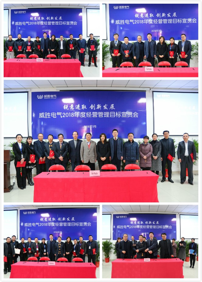 會議第二階段舉行電氣2018年經營管理目標簽字儀式:首先,電氣董事長曹總鄭重向控股董事會吉主席簽署2018年目標承諾書;隨后,威勝電氣總裁曾辛先生向電氣董事長曹總簽署2018年目標承諾書;接著,由電氣經營管理團隊責任人、銷售負責人簽2018年目標承諾書。