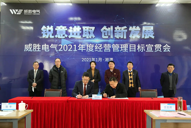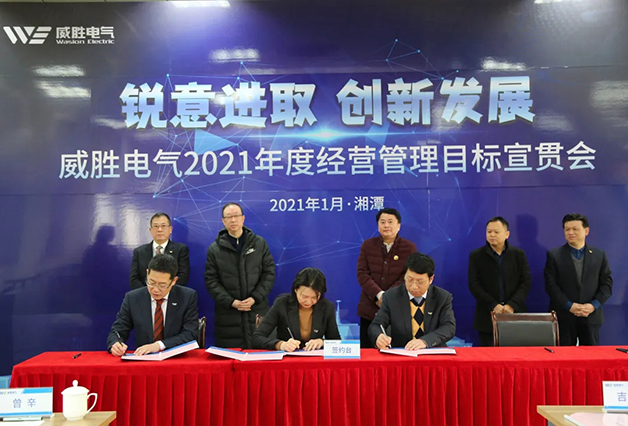 鄧超艷女士宣讀了2021年威勝電氣核心經營管理團隊和核心中層干部的人事任命。在控股董事會及各位領導同仁的共同見證下,電氣董事長、總裁及核心經營管理團隊及核心中層干部正式簽署了2021年度經營目標任務書。