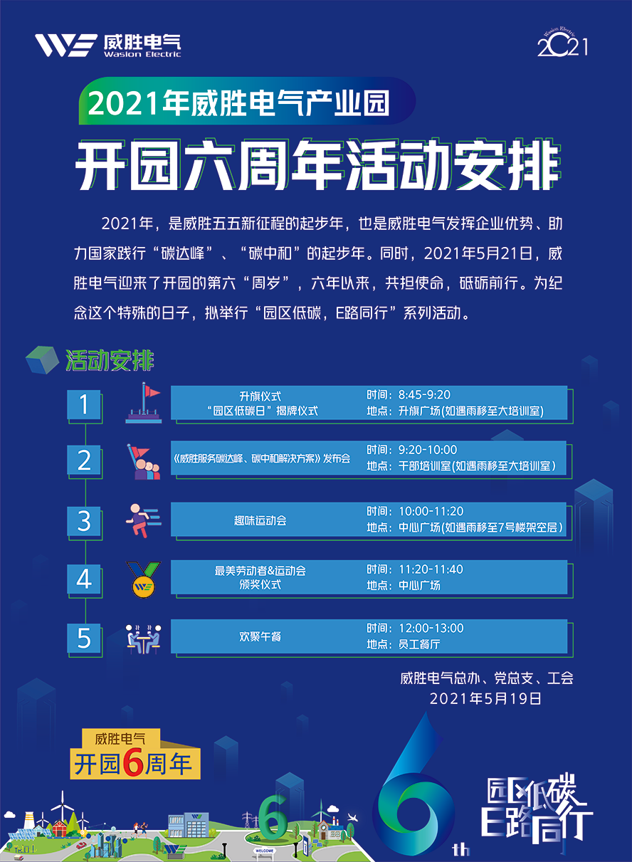 2021年5月21日是威勝電氣開園六周年,將開展“園區(qū)低碳、E路同行”系列活動(dòng)。具體安排詳見下方海報(bào):