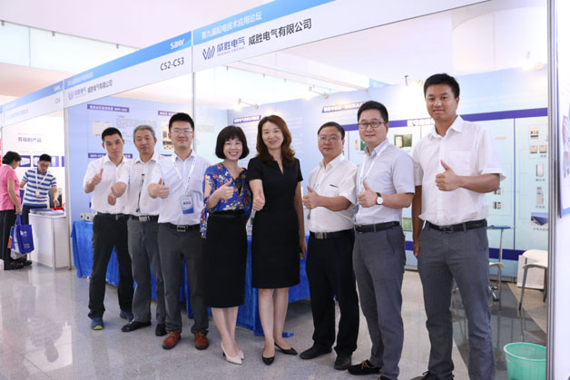 【威勝電氣董事長曹朝輝女士,總裁助理、電網銷售中心總經理張蓓女士與參展工作人員合影】